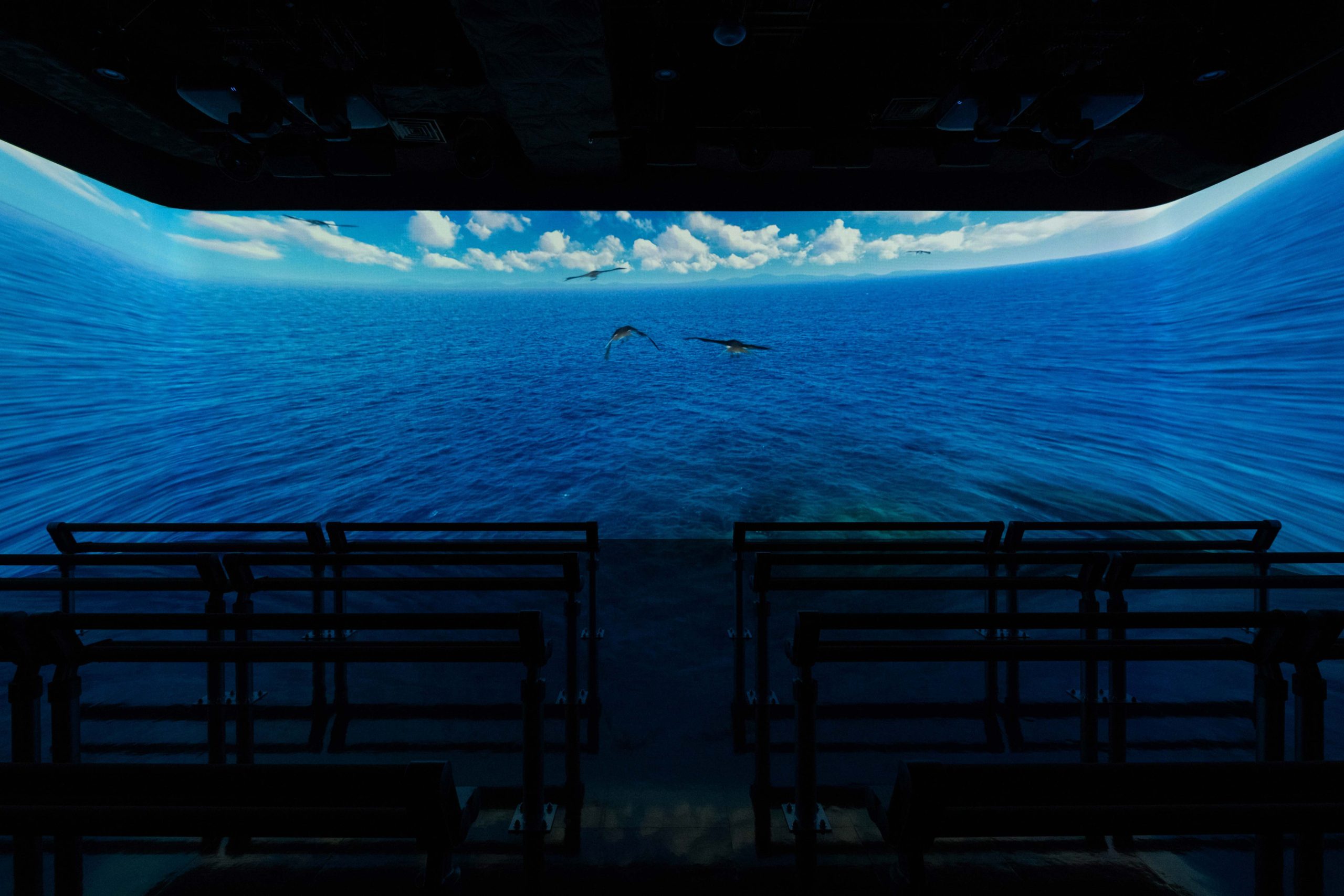 「海洋水面」的幽暗空間中,行走在地面的巨大玻璃上俯瞰約6公尺高的水箱,彷彿漫步水面般奇幻。