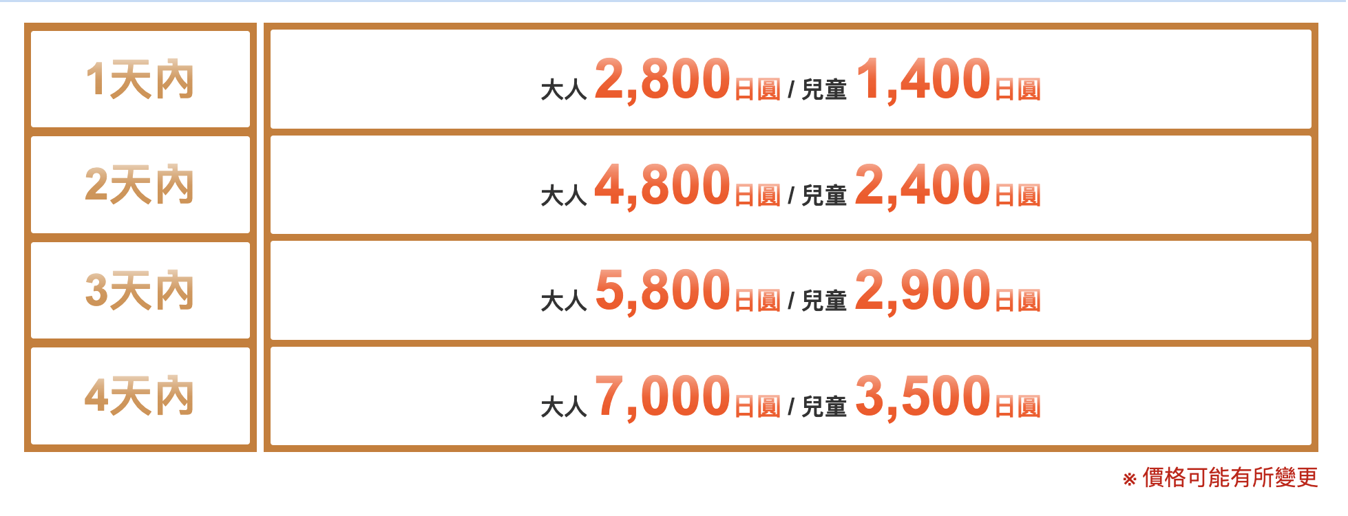 • 第3名幼兒起即需另行購買兒童用之鐵路周遊券
