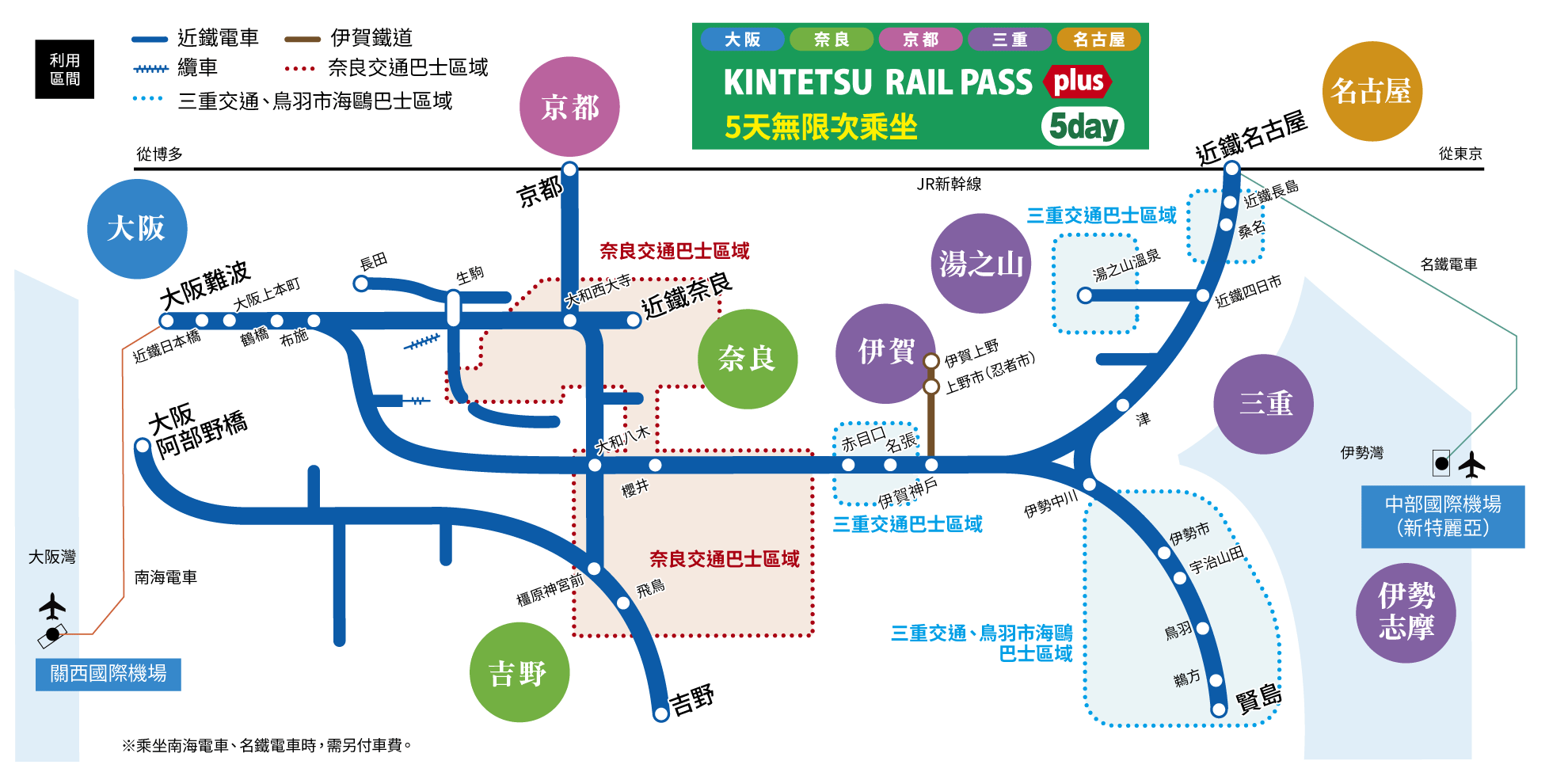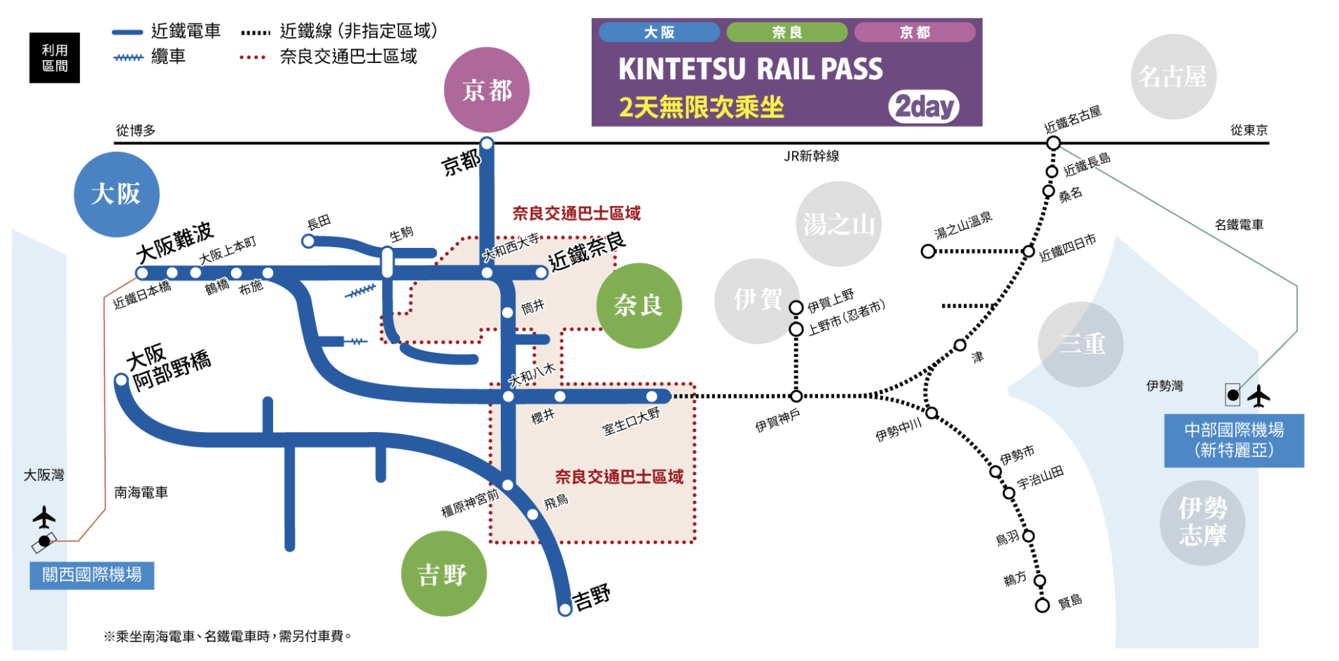 可自由暢乘連接大阪、京都、奈良、三重、名古屋的近鐵電車全線(空中纜車除外)的周遊券。