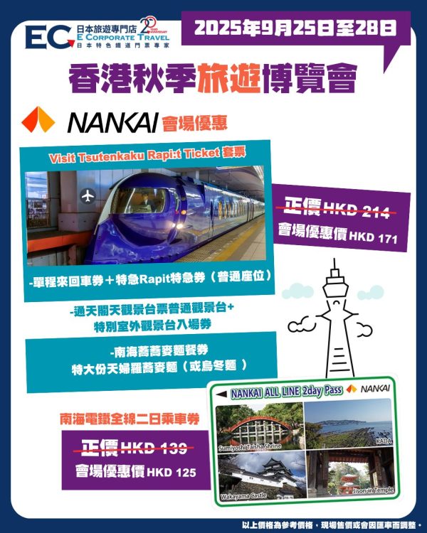 【25-28/9/2025旅遊博覽優惠】南海Rapi:t&南海蕎麥麵&通天閣展望台優惠套票