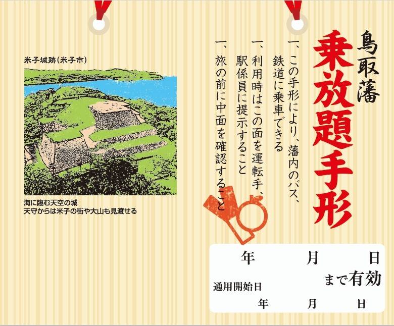 - 最初請於以下任一起始點出示本票券:①米子國際觀光服務所 ②JR倉吉車站內觀光服務所 ③鳥取市觀光服務所