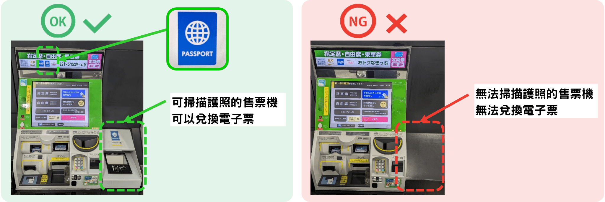 ※若售票機故障或持有之護照沒加IC晶片請至指定車站綠色視窗兌換實體車票。