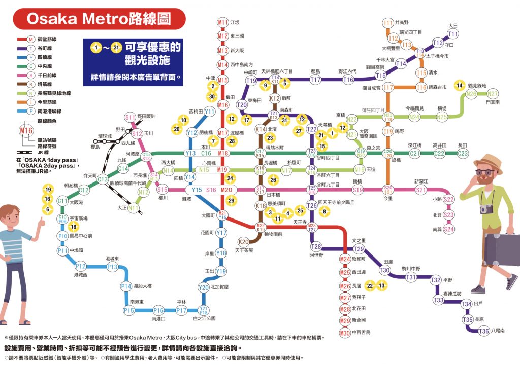 • 一經入閘可1日/任選2日(可不連續)任搭指定大阪市營地下鐵、新電車(New Tram)、巴士。